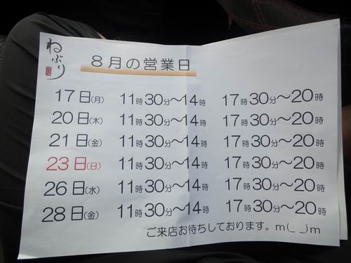 8月の営業日は下記のとおり。夜も営業しているのはうれしいですね。
